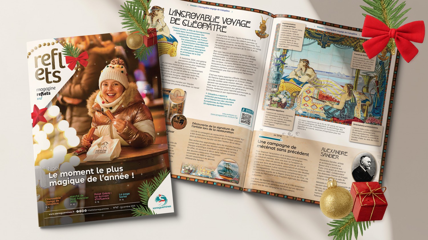 Au sommaire de ce numéro hivernal : un dossier captivant sur “L’incroyable voyage de Cléopâtre”, retraçant la restauration et le retour d’une œuvre majeure au Musée de la Faïence. Côté actualités, la Ville poursuit sa modernisation : nouveaux panneaux digitaux, dynamique commerciale en centre-ville, actions en faveur de la propreté et de l’habitat.