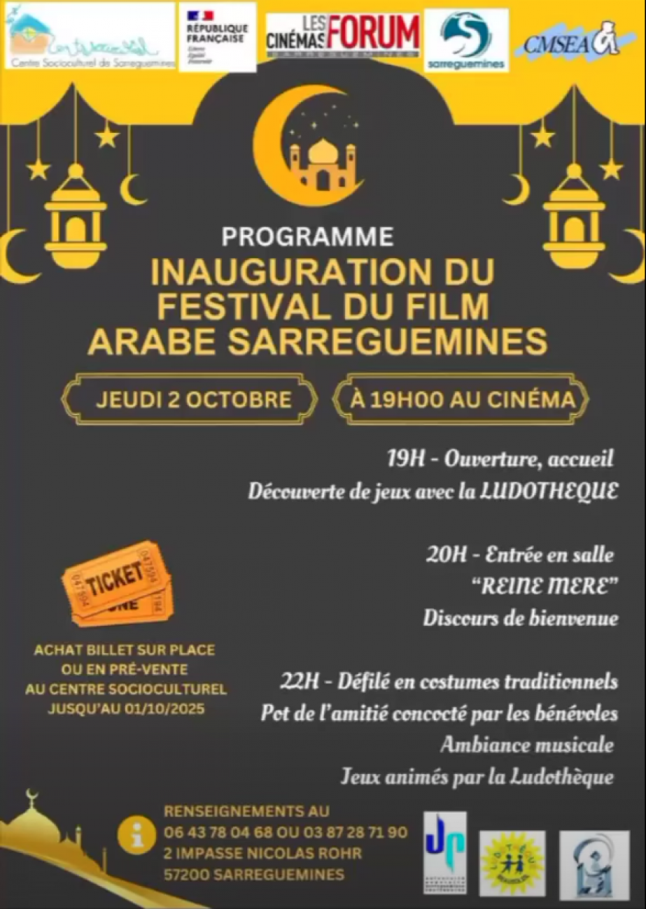 La 36e édition du festival du film arabe de Fameck / Val de Fensch se décentralise aux Cinémas Forum de Sarreguemines du 2 au 14 octobre 2025. Un événement qui se déroule en partenariat avec la Ville de Sarreguemines, le Centre Socioculturel, l'Université Populaire Sarreguemines Confluences,l'Espace Seniors de Sarreguemines, le CMSEA et la ludothèque Beausoleil.