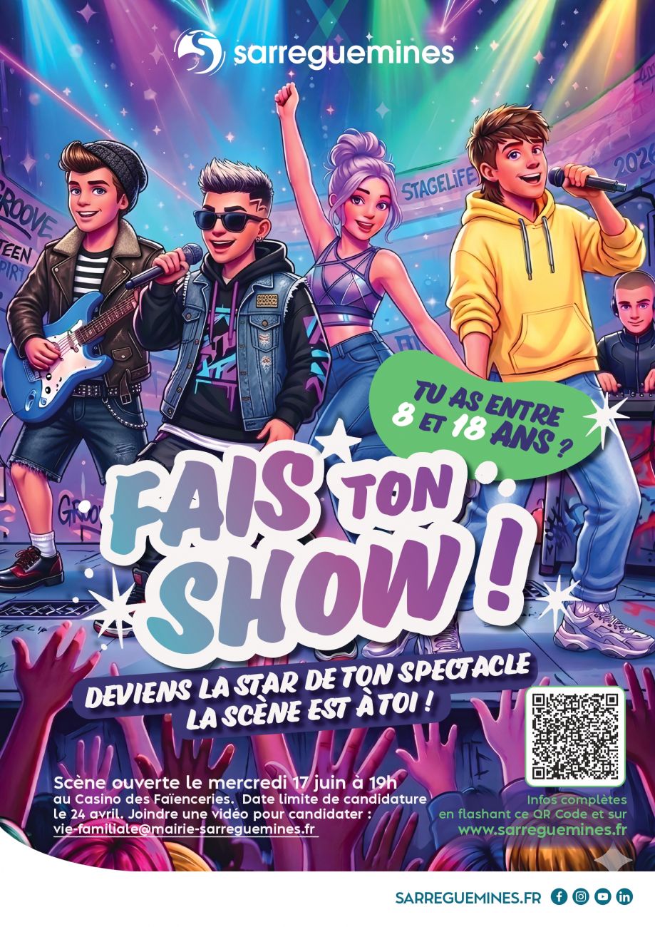 Pour candidater à la scène ouverte, envoyez une vidéo de votre prestation avant le 24 avril 2026 à l’adresse suivante : vie-familiale@mairie-sarreguemines.fr